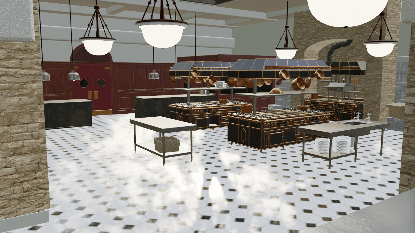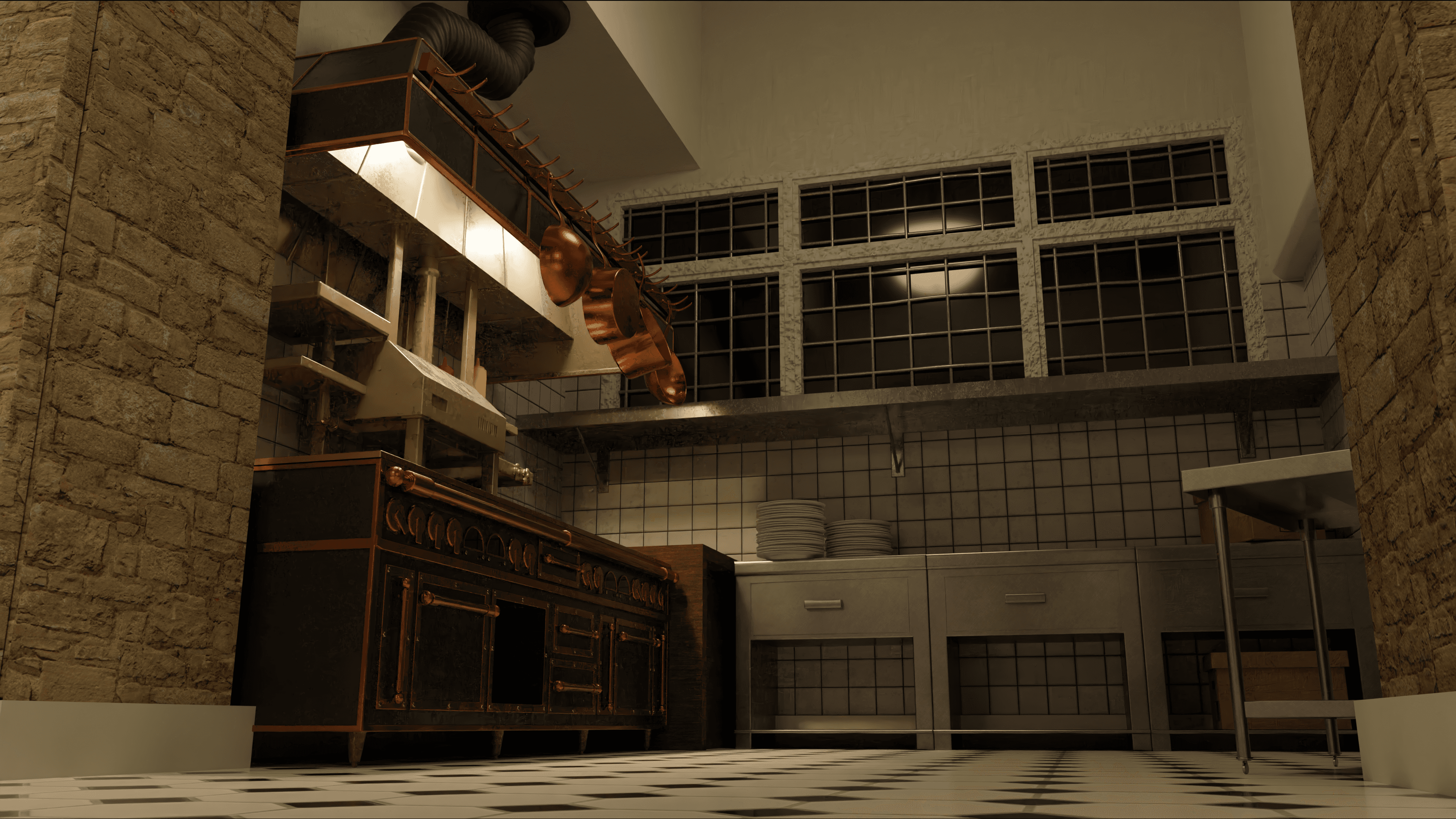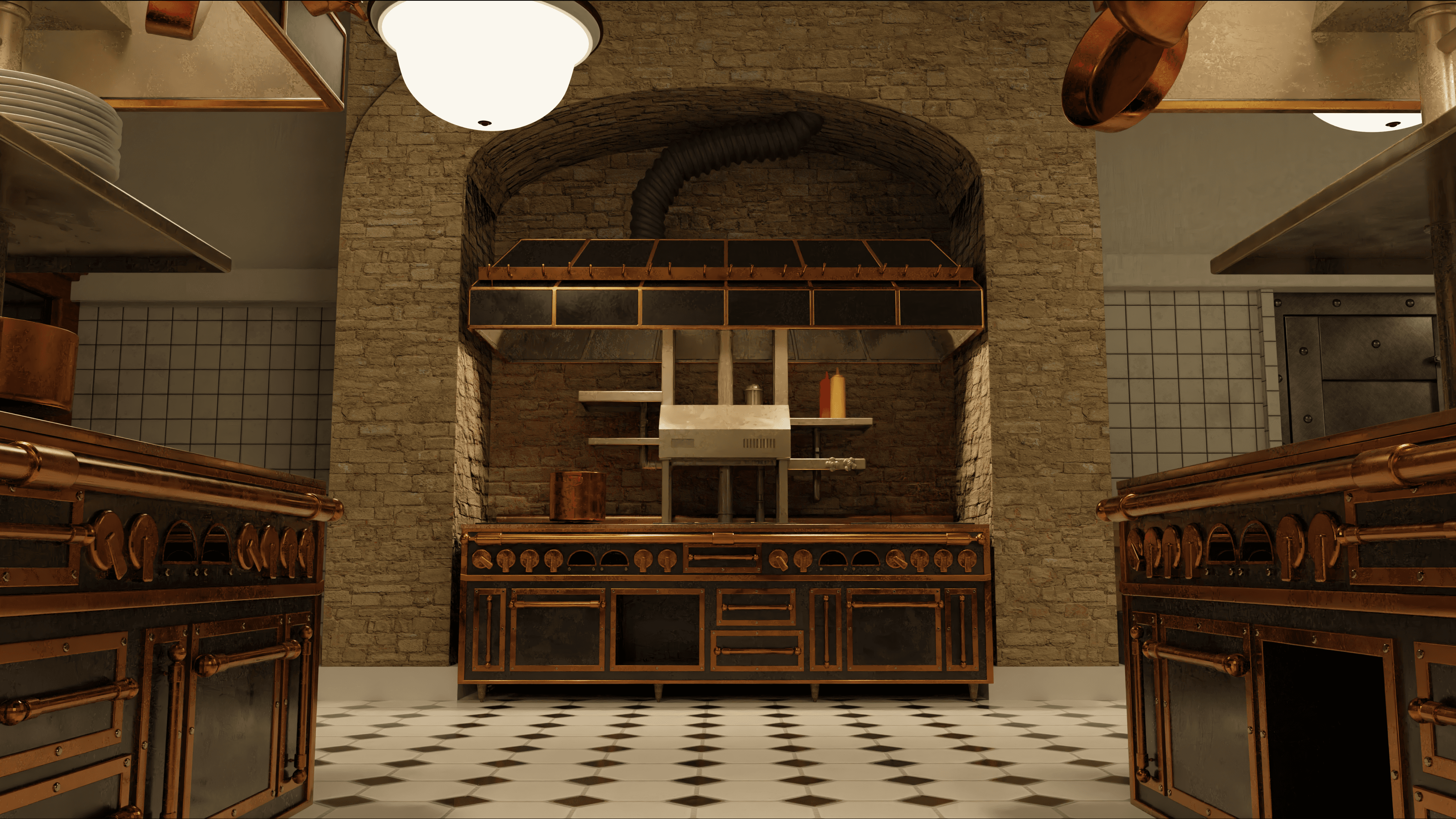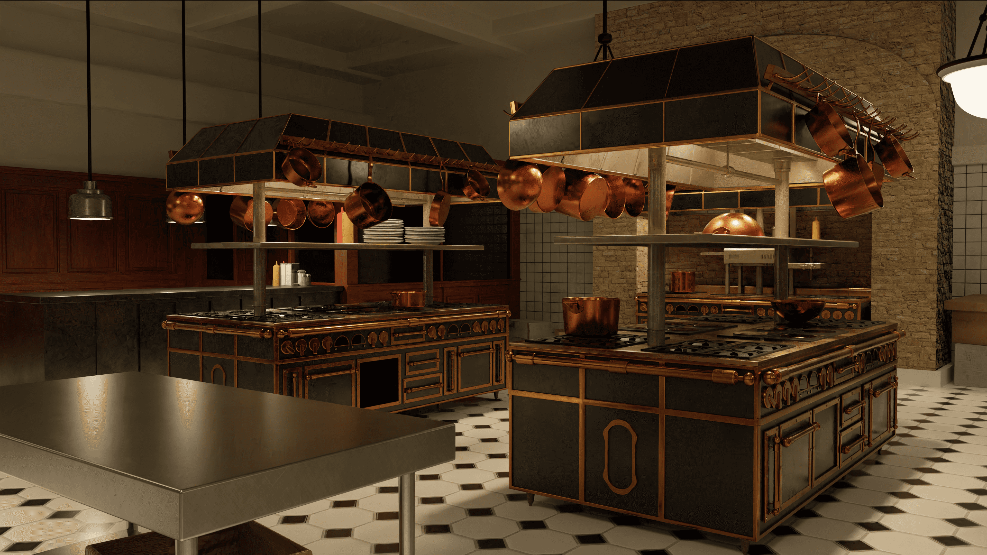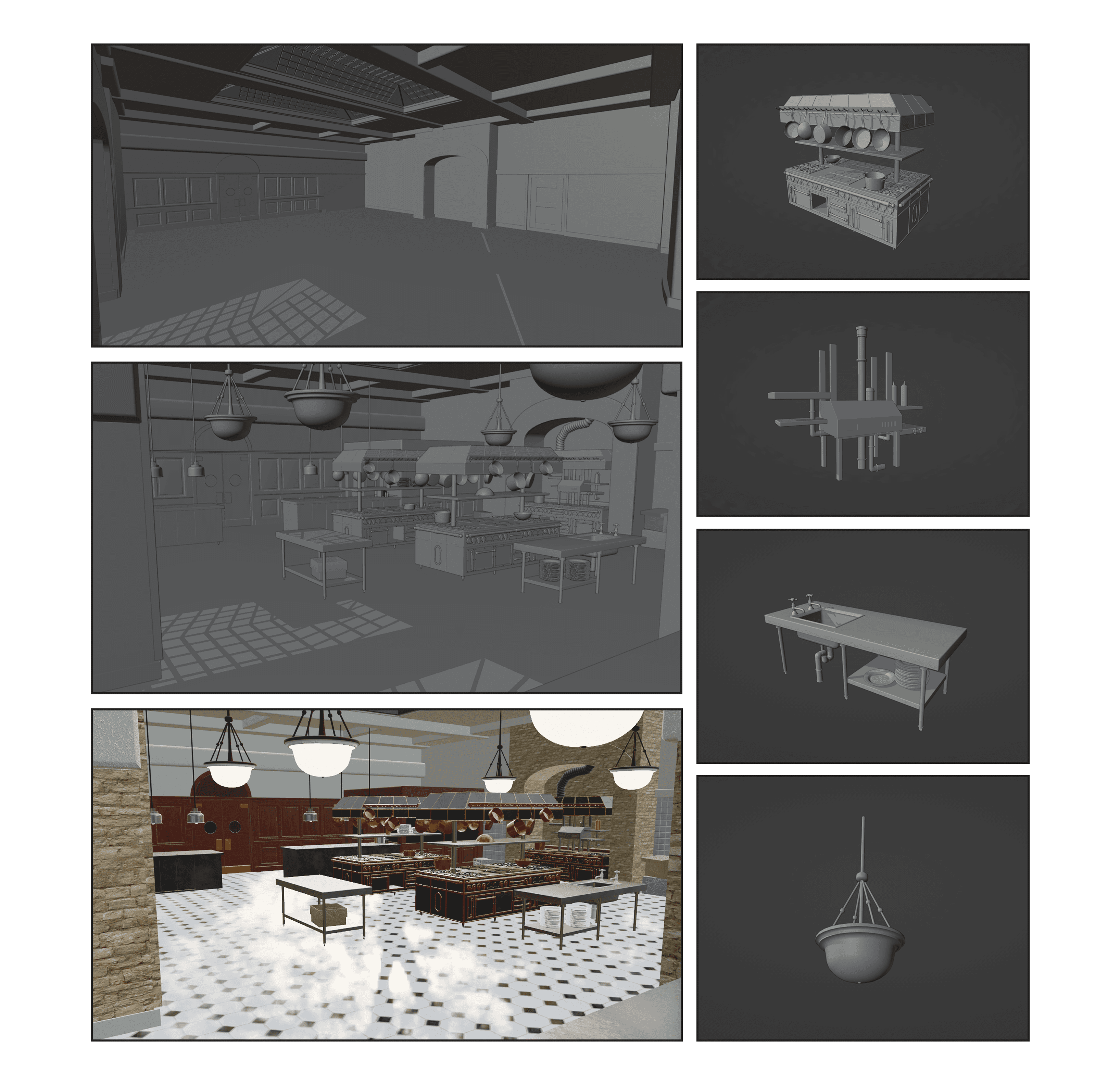 The kitchen included metallic and rustic textures, realistic cooking tools, and layered details that made it feel like a fully functional kitchen.