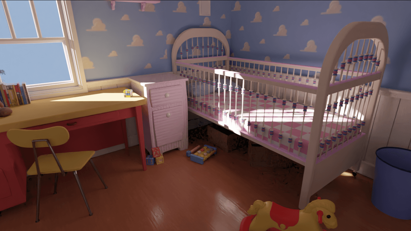 Due to the technological limitations of the 90s, Toy Story used simple, low-polygon environments that focused on broad, recognizable shapes.