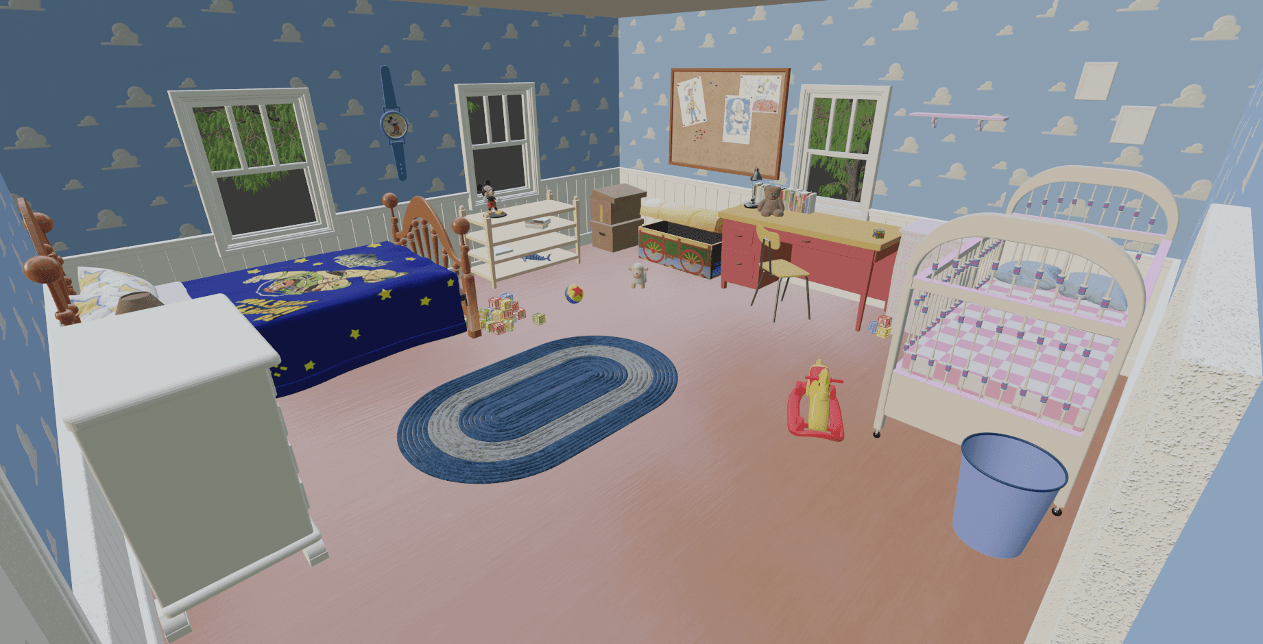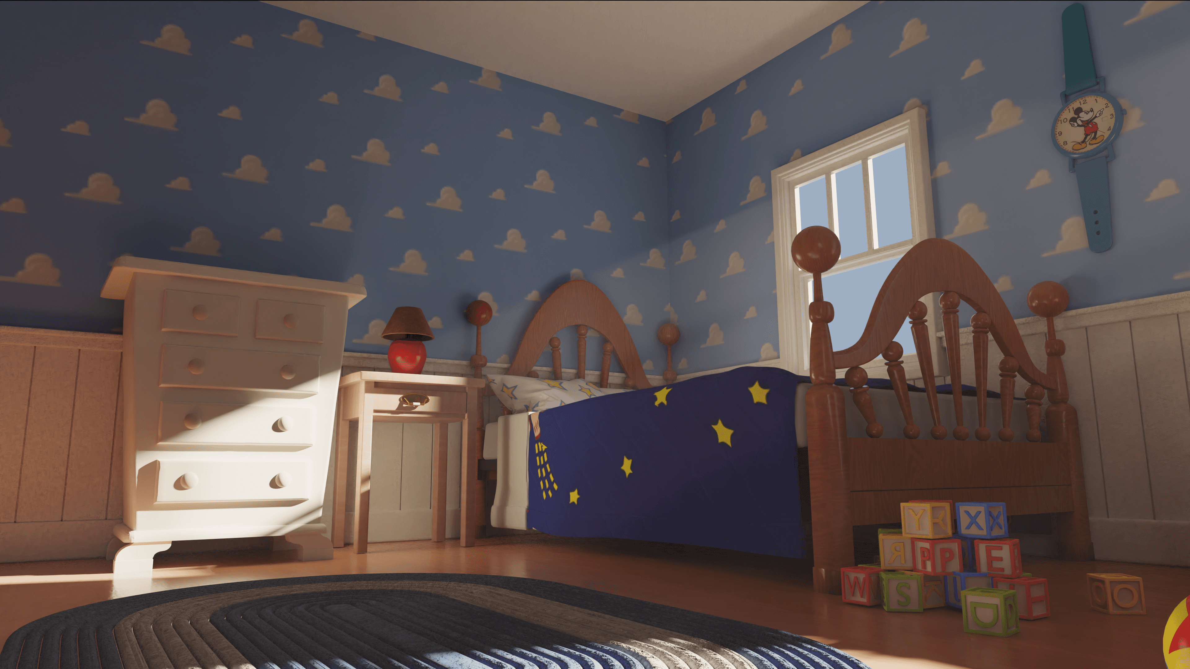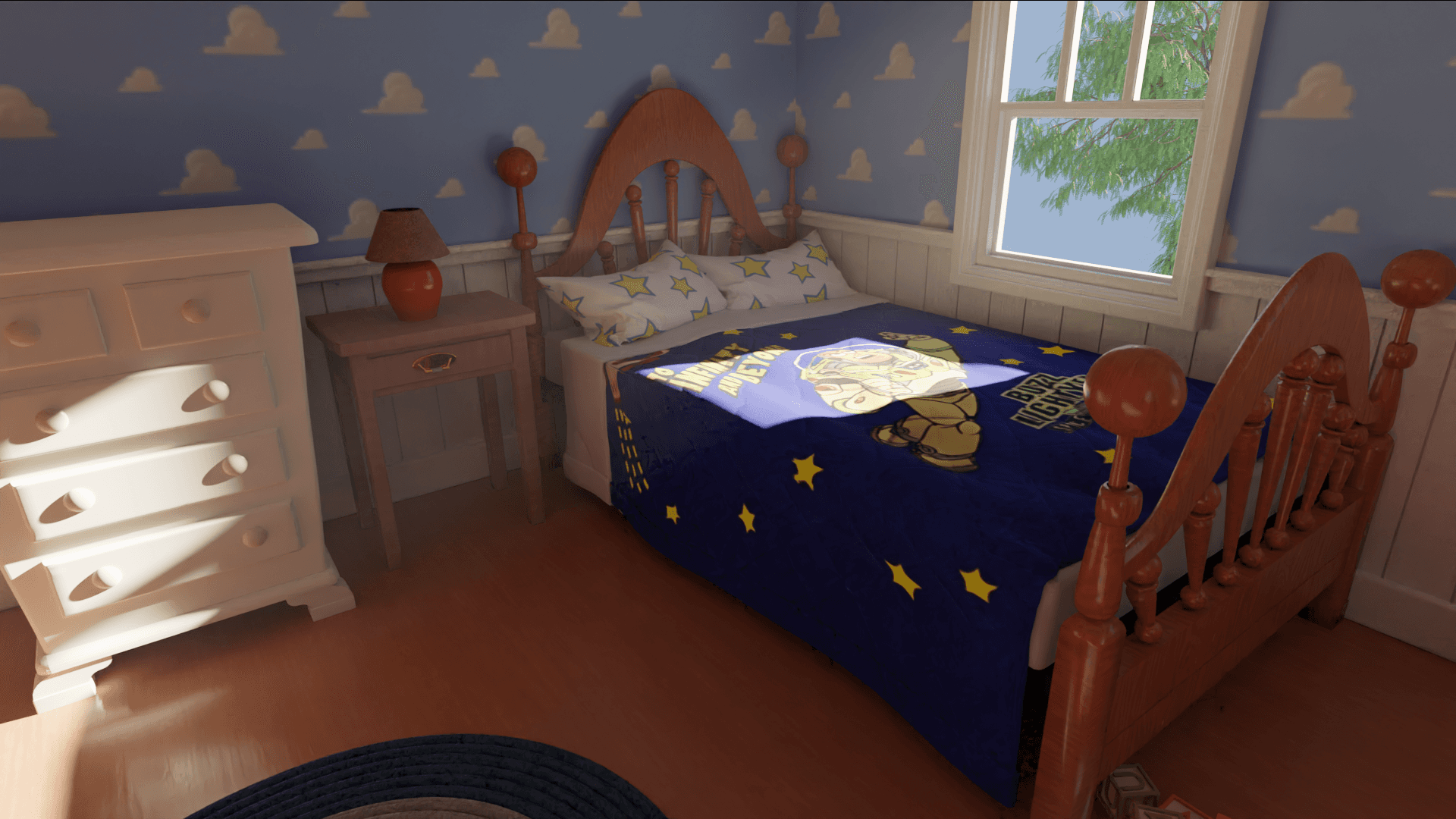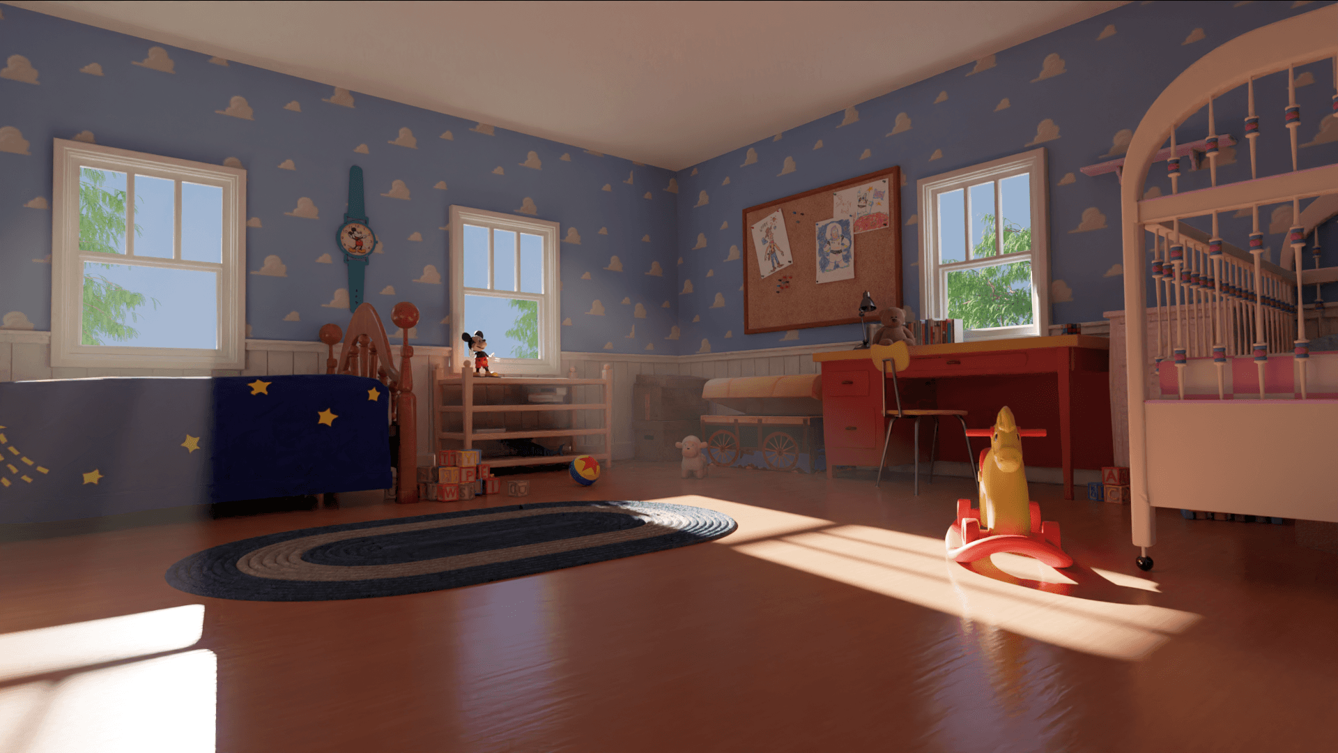 Basic but effective lighting helped establish a warm, homey atmosphere in Andy’s room. Textures, though simpler, were used strategically to make objects recognizable without unnecessary detail.